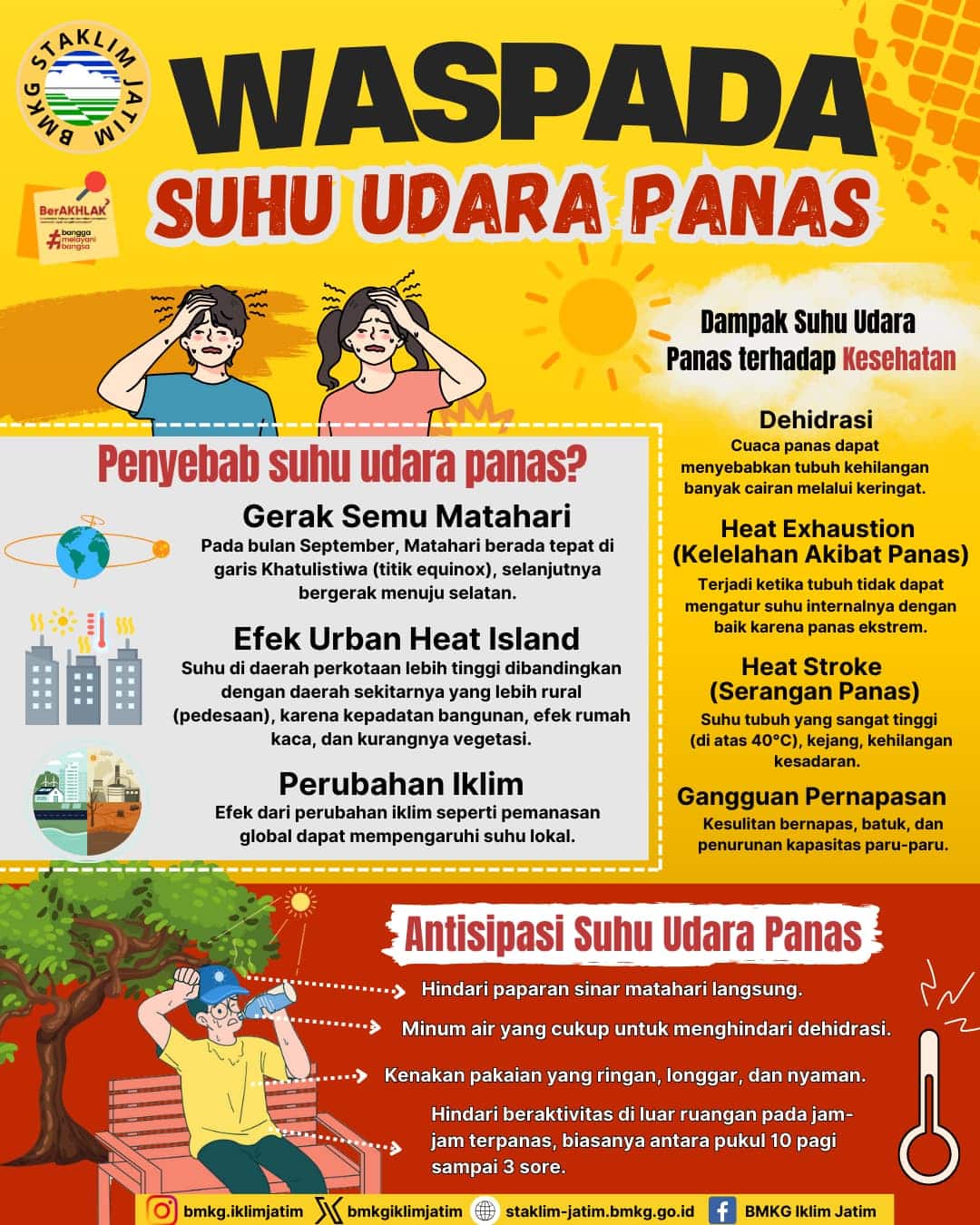 Cuaca panas ini dapat menyebabkan dehidrasi, heatstroke, dan meningkatkan risiko kebakaran hutan. BMKG mengimbau masyarakat untuk: